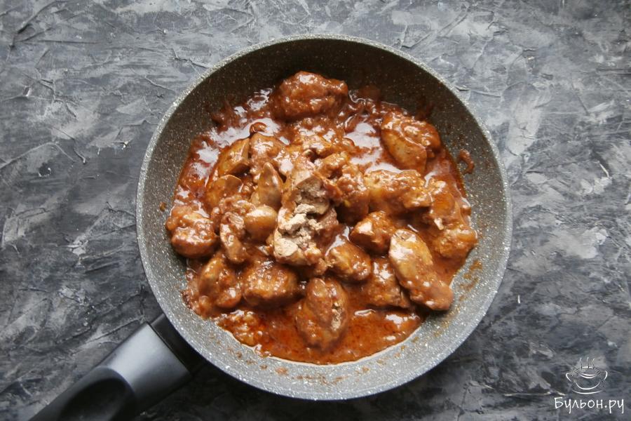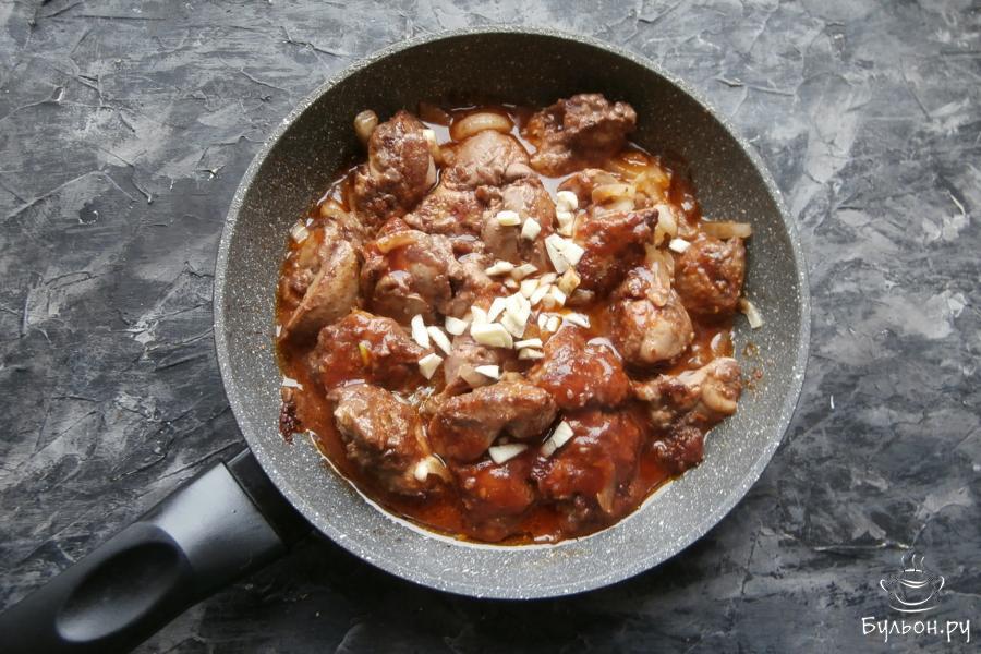 5. Все перемешать, обжаривать в течение нескольких минут. К печени добавить измельченный зубчик чеснока, влить подготовленный соус еще 100 мл воды.