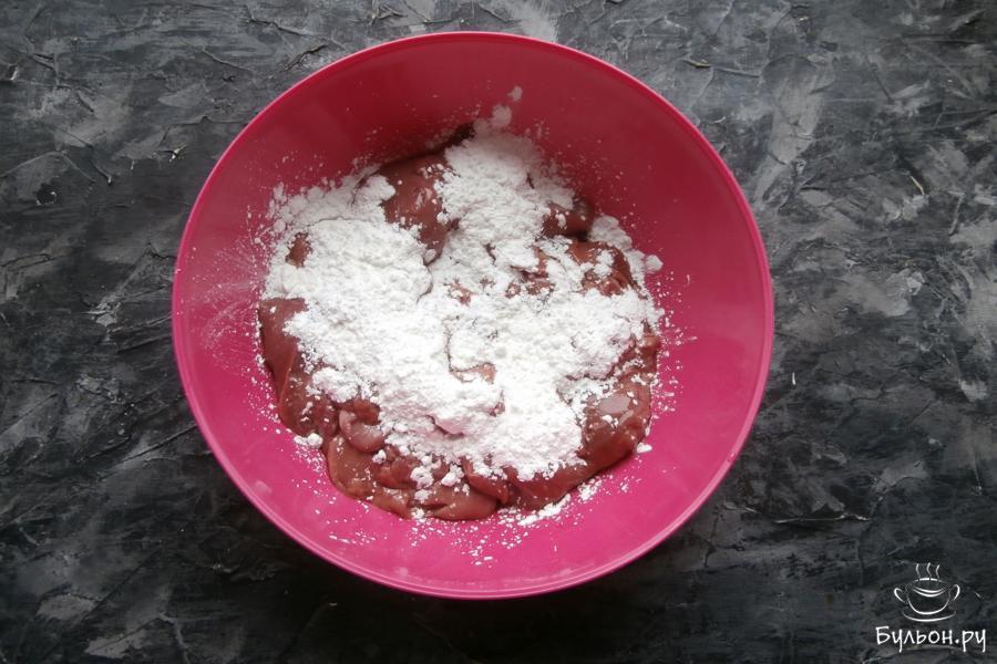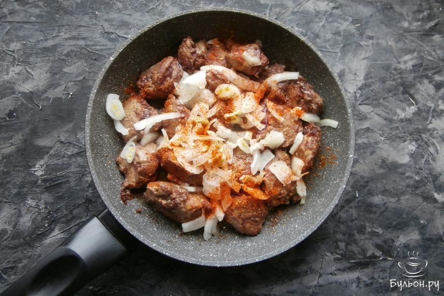 4. Печенку аккуратно перемешать и отправить ее в горячую сковороду с любым растительным маслом. Жарить печенку до изменения цвета сверху, добавить порезанную произвольно 1 луковицу, посолить, посыпать приправой.