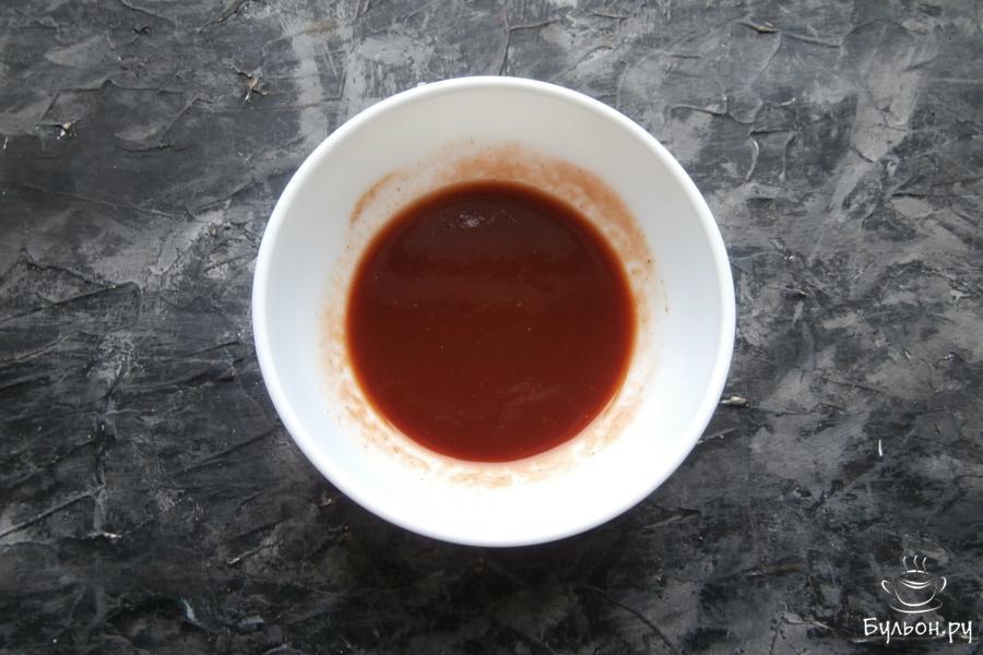 1. К 1 ст. л. соуса соевого добавить 1 ч. ложку жидкого меда, 2 ч. л. томатной пасты, всыпать черный перчик и немного молотого чили.