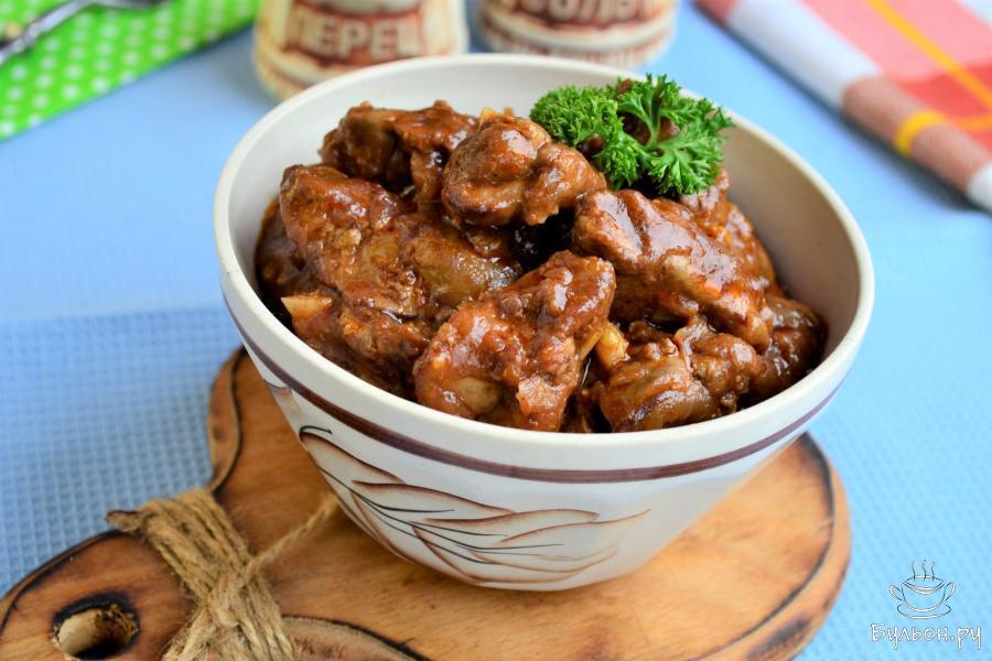 6. Тушить печень на небольшом огне около 10-15 мин. Готовность можно проверить разрезав кусочек печени - в середине не должно быть крови.