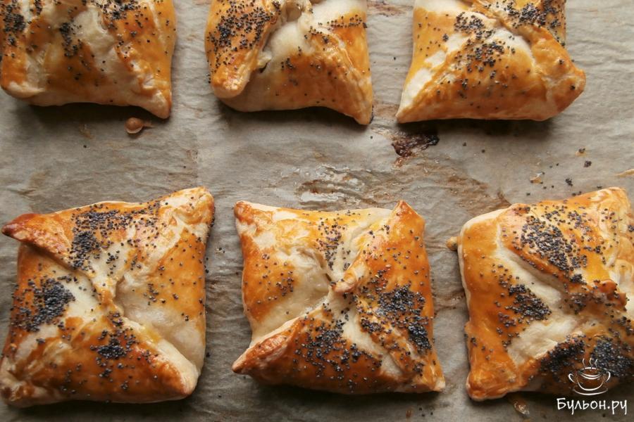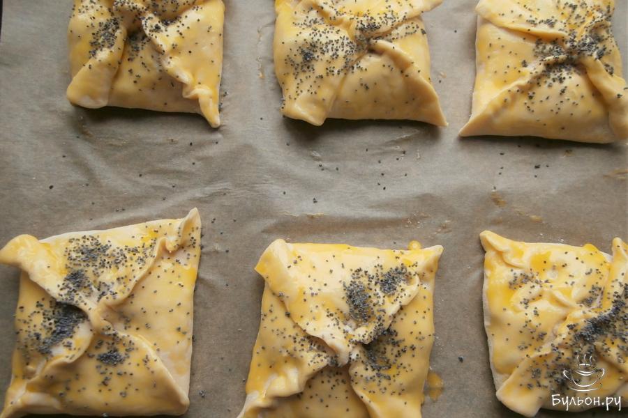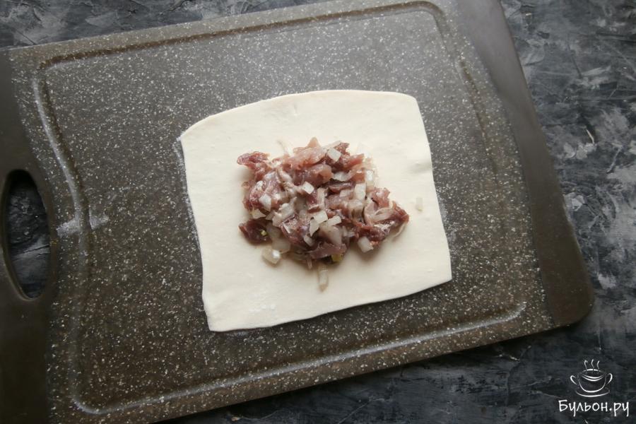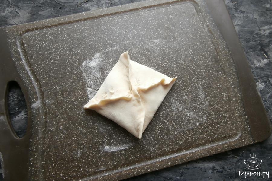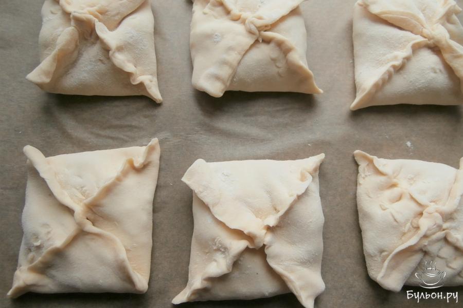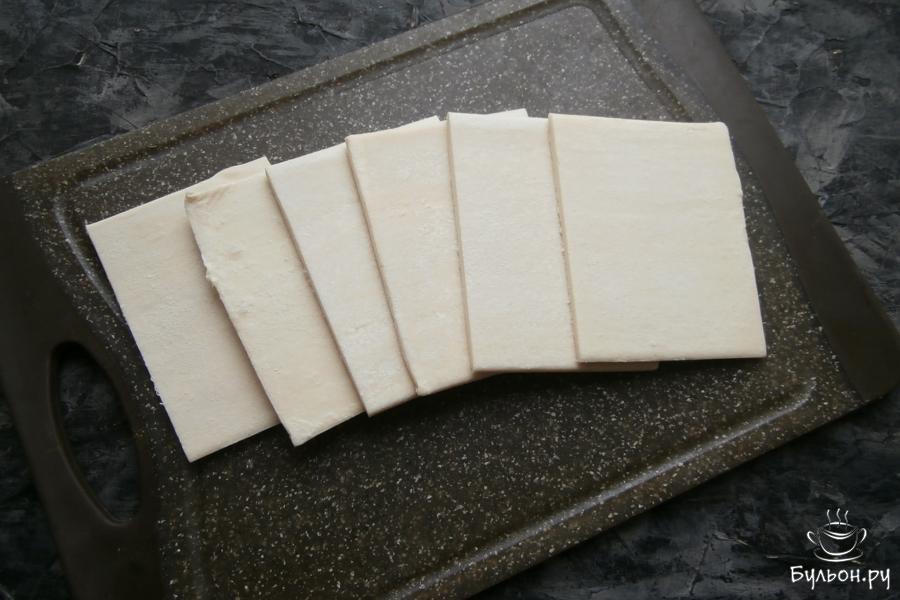 4. 250 г теста чуть разморозить, порезать на квадраты, немного раскатать, чтобы размер каждого квадрата был 10х10 см.