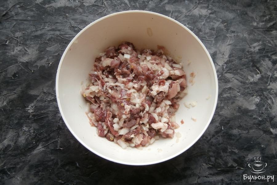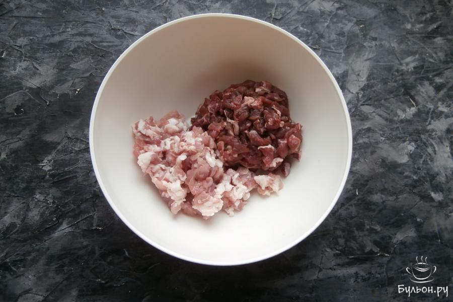 1. Мякоть баранины (140 г) и жирненькую свинину (140 г) порезать мелкими кусочками (порубить ножом или топориком).