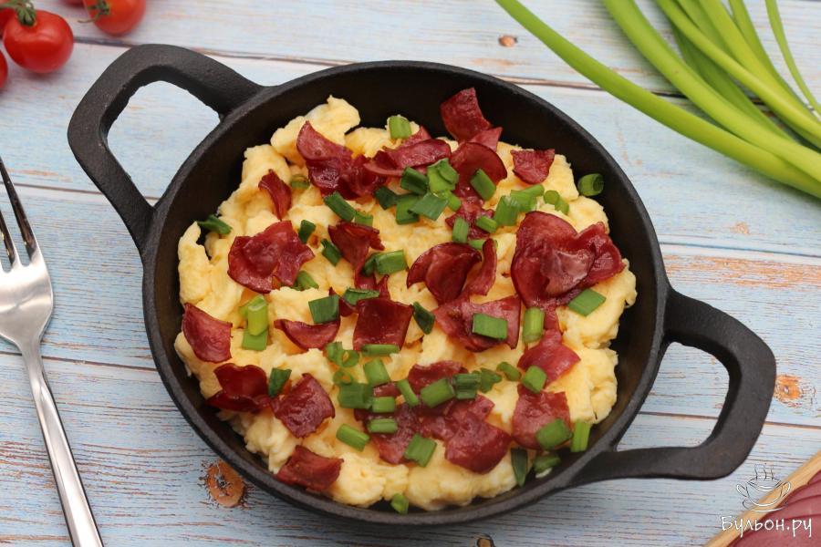 Скрэмбл с говядиной и зеленым луком это идеальное блюдо для завтрака и не только. Получается он очень нежным, легким и воздушным. Скрэмбл просто тает во рту. А кусочки мяса и колечки зеленого лука делают блюдо еще более ярким и богатым на вкус. В данном рецепте использовались ломтики говядины, но вместо говядины можно использовать и другое мясо. Это может быть бекон, карбонат, ветчина и даже докторская колбаса.