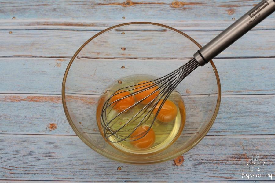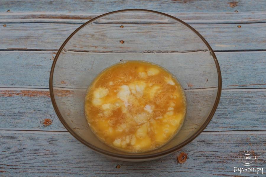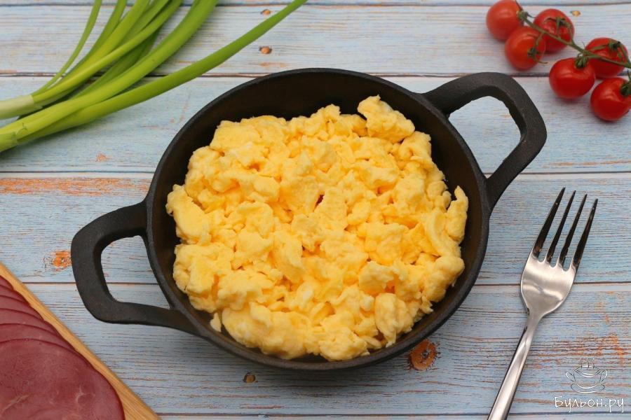 5. На сковороду кладем оставшееся масло и разогреваем его. Вливаем в нее будущий скрэмбл. Как только яичная масса начнет схватываться, начинаем аккуратными движениями перемешивать массу из яиц. Готовим все на средней температуре. Помешиваем постоянно и доводим до нужной консистенции.