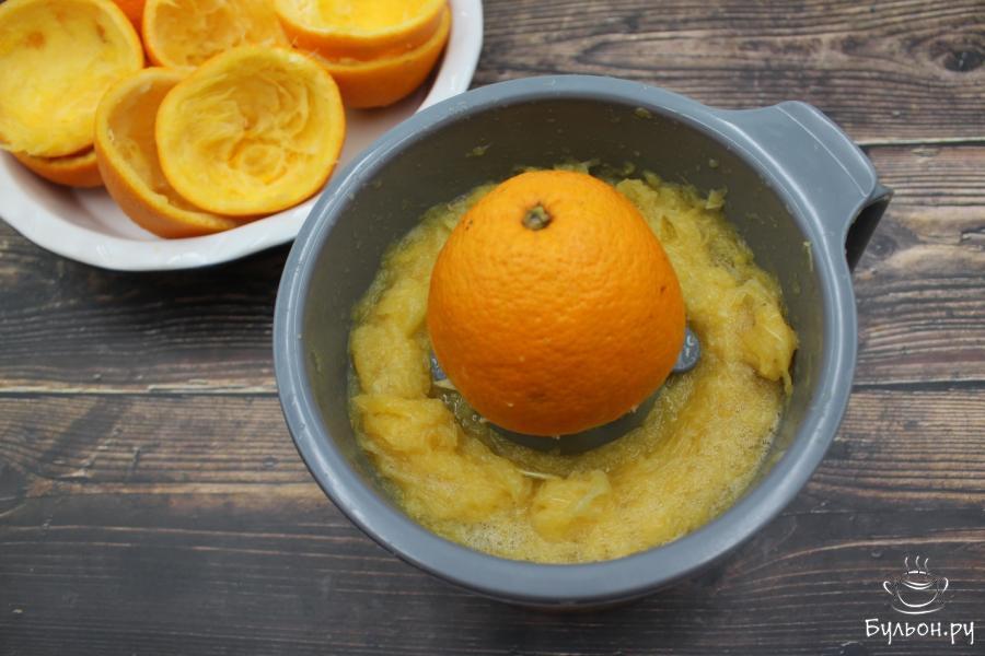 4. Теперь выдавите сок из половинок апельсина. При этом, когда скапливается много жмыха, удаляйте его, чтобы не было разбрызгивания.