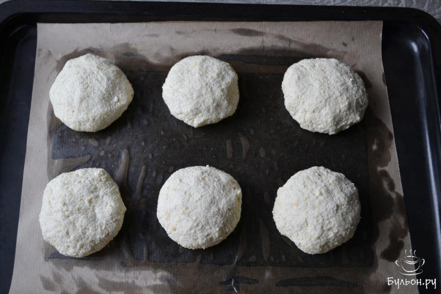 5. Смажьте пекарскую бумагу растительным маслом. Скатайте небольшие лепешки из теста. Положите будущие сырники на пекарскую бумагу и поставьте в заранее разогретую до 180С духовку.