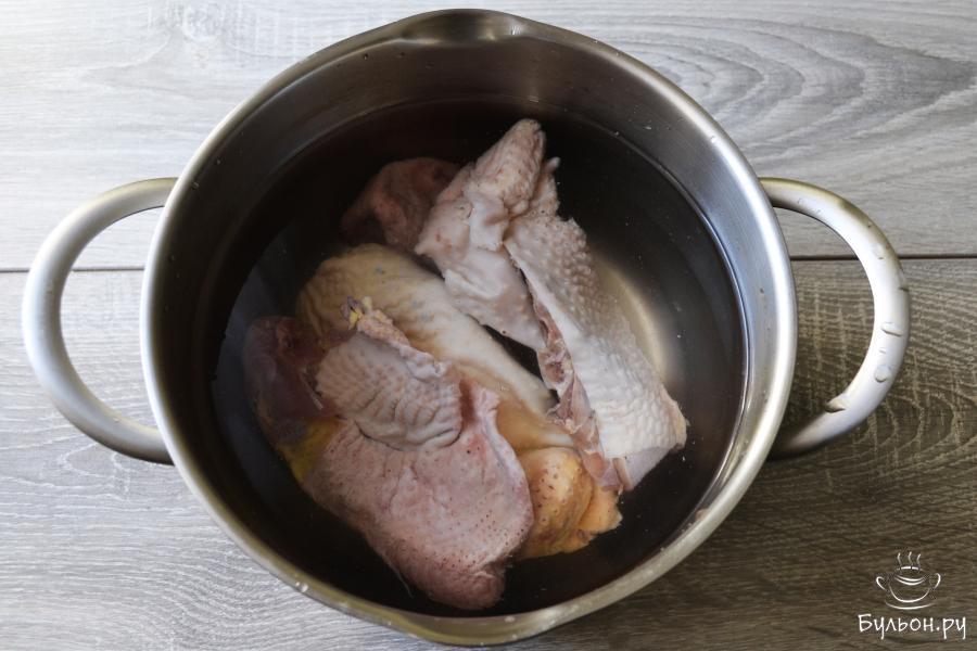2. Варите на умеренном огне до готовности куриного мяса. Во время варки обязательно снимите пену и посолите бульон.