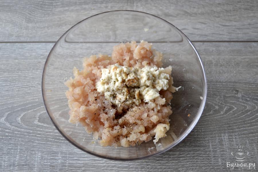 2. Положите в миску подготовленный фарш, посолите и посыпьте черным молотым перцем и добавьте размягченных батон. Тщательно руками вымешайте фарш с батоном, чтобы он стал однородным.