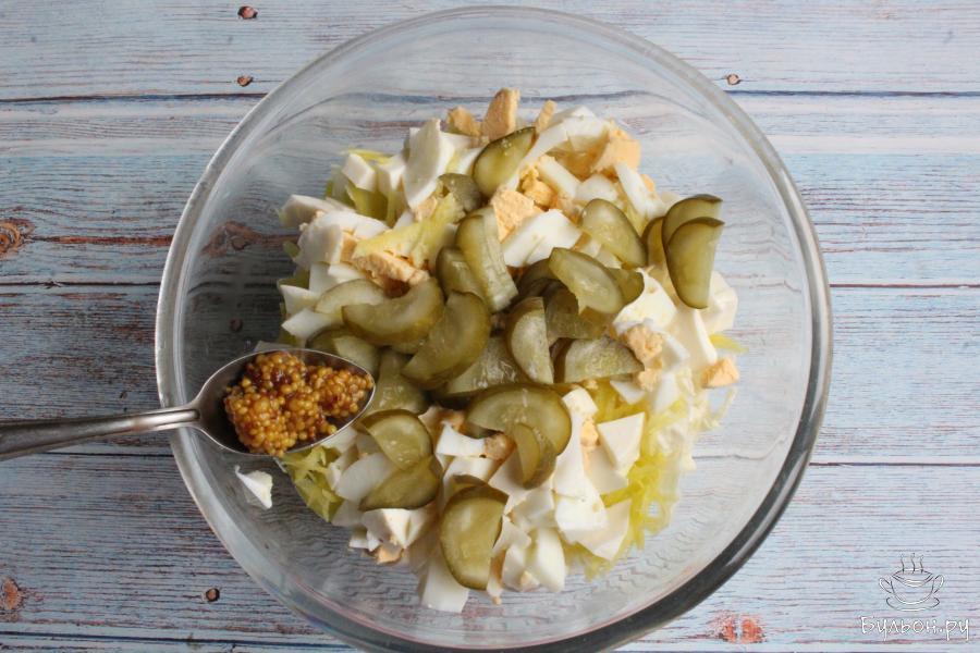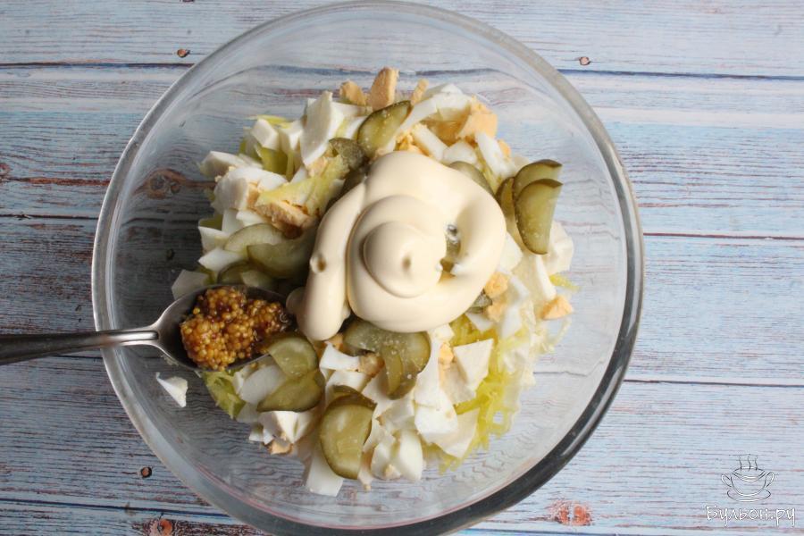 7. Добавим в салат майонез и соль. Если огурцы и брынза сильно соленые, то салат можно не солить. Перемешиваем салат.