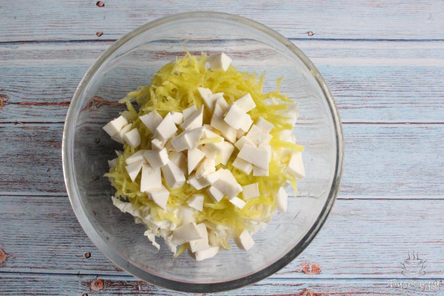 4. Яйца отварим вкрутую 10 минут после закипания воды, остудим яйца, почистим и нарежем их небольшими кубиками.