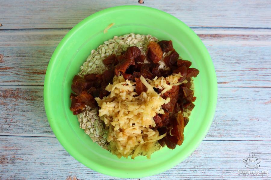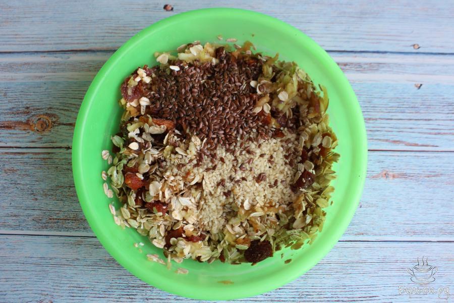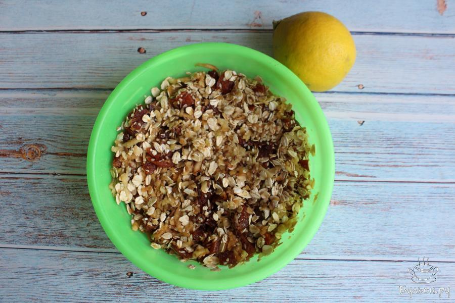 7. Добавляем к хлопьям лимонный сок, перемешиваем. Смотрим хватает ли жидкости. Если "тесто" слишком сухое, то можно добавить еще яблок.