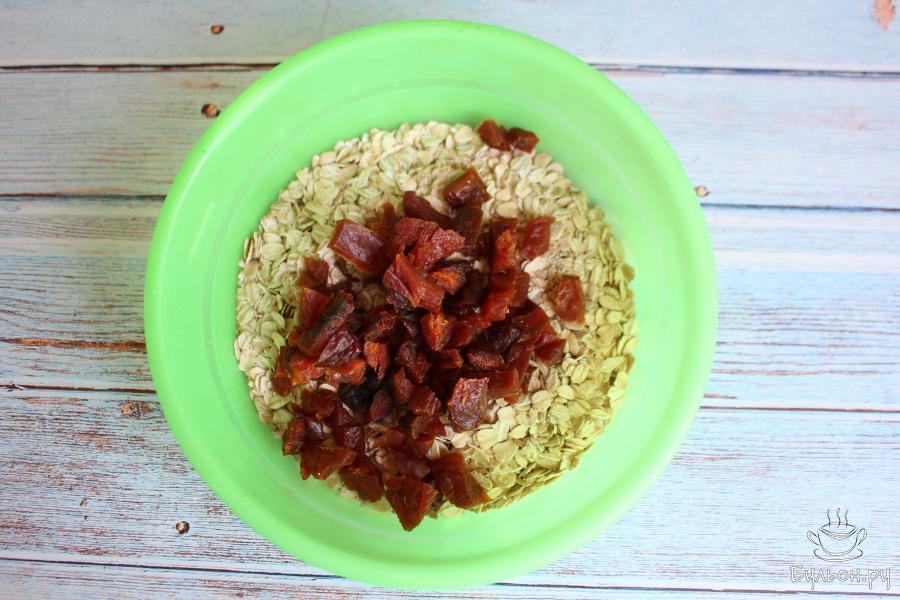 2. Курагу режем небольшими кусочками. Если вы не любите кусочки, то можно прокрутить курагу через мясорубку. Курагу желательно выбирать мясистую, сладкую и мягкую. Если курага твердая, то ее нужно замочить в кипятке на 15 минут.