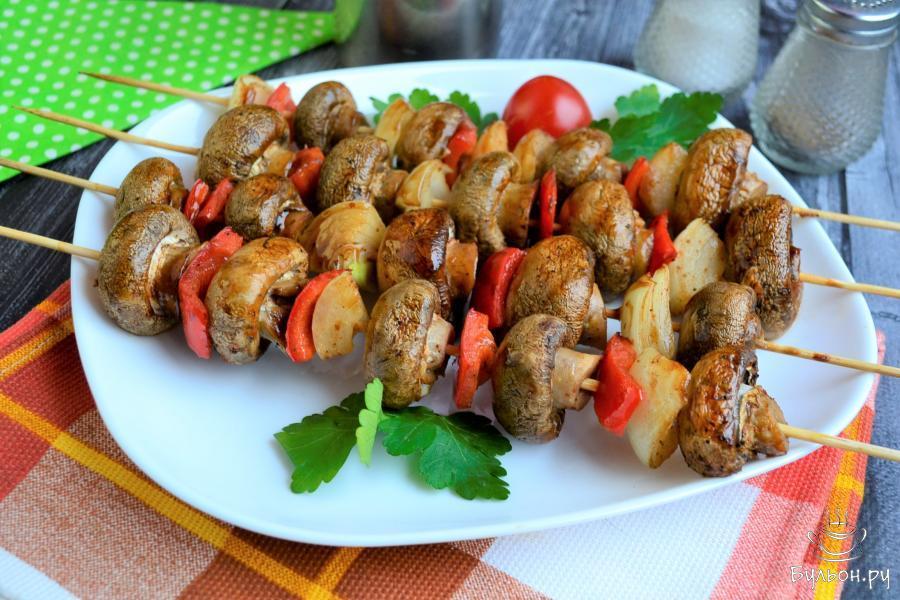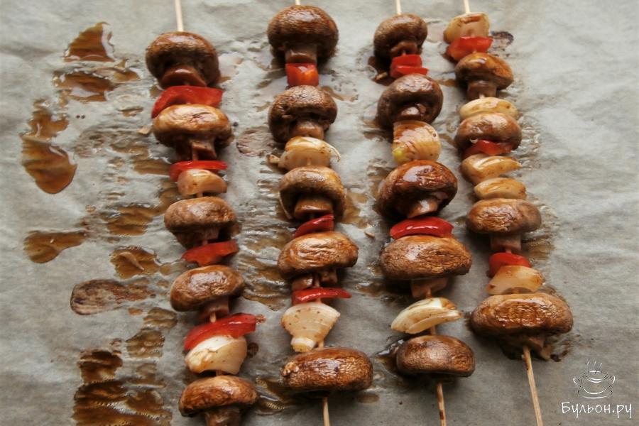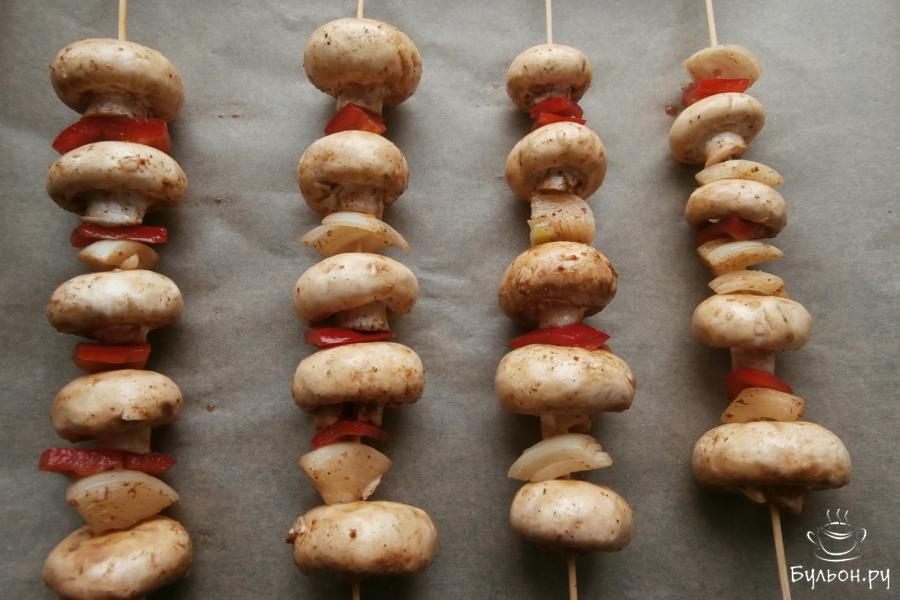 5. Далее, чередуя грибы, лук и перец, нанизать все на предварительно замоченные в теплой воде на 10 минут шпажки. Разместить шпажки на противне, который лучше застелить пергаментом.