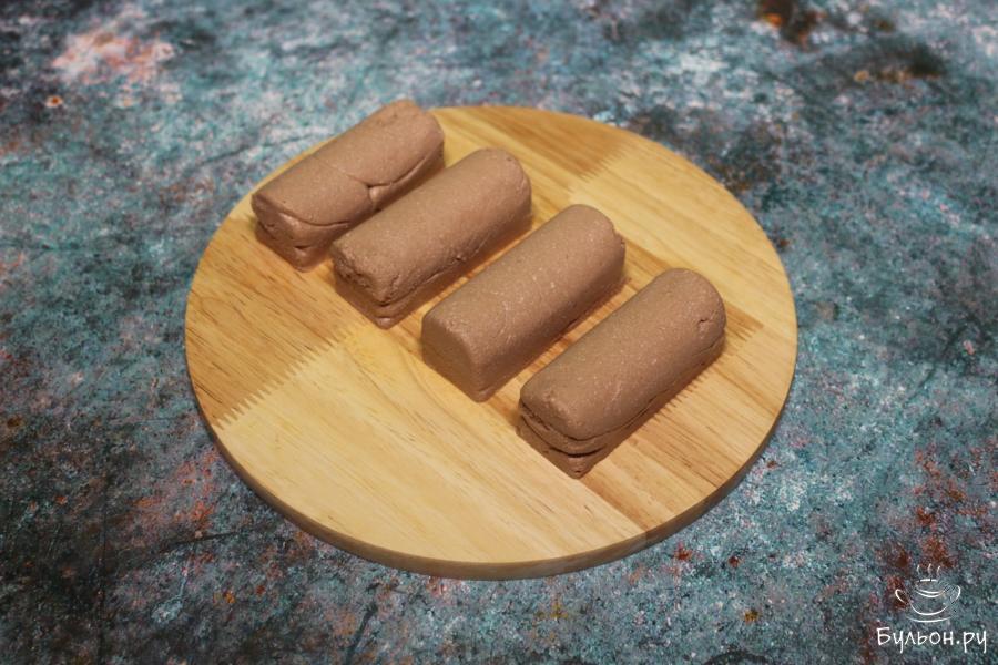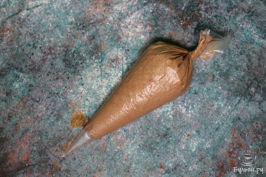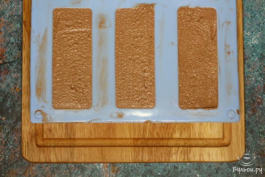 4. У мешка отрежем конец и выдавим в ячейки формы шоколадный творог. Все разровняем, излишки уберем с помощью шпателя.