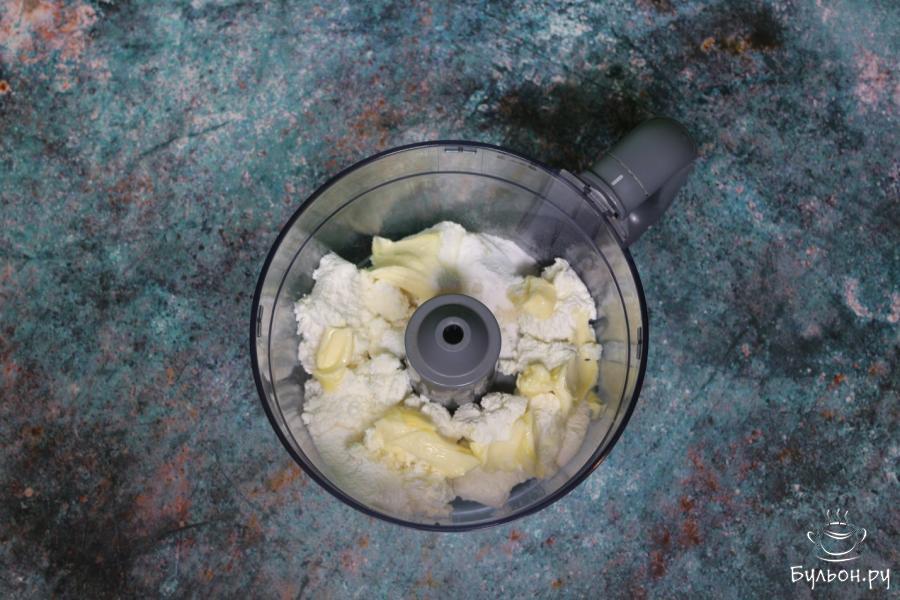 1. Положим весь творог в чашу фудпроцессора. Также в нее выложим и остальные составляющие будущих сырков. Это мягкое масло, пудра и ароматизатор со вкусом ванили. Включим фудпроцессор и сделаем творожную массу однородной.