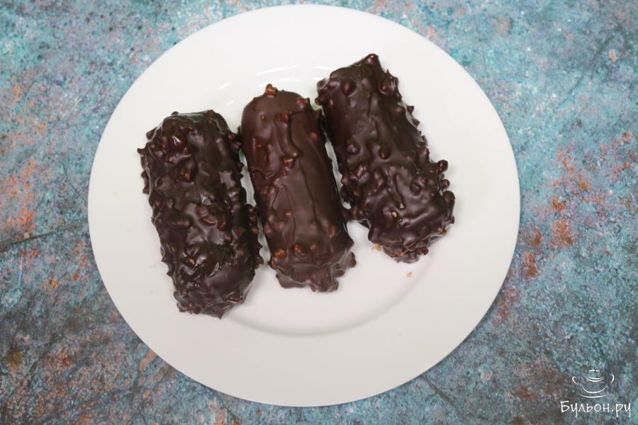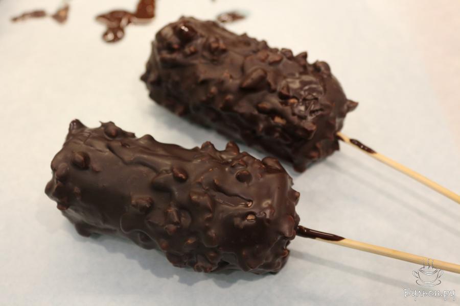 9. В замороженные сырки втыкаем шпажки и окунаем их в шоколад буквально на 2 секунды. Как только глазурь схватилась, сырки кладем на пергамент для полного застывания глазури.
