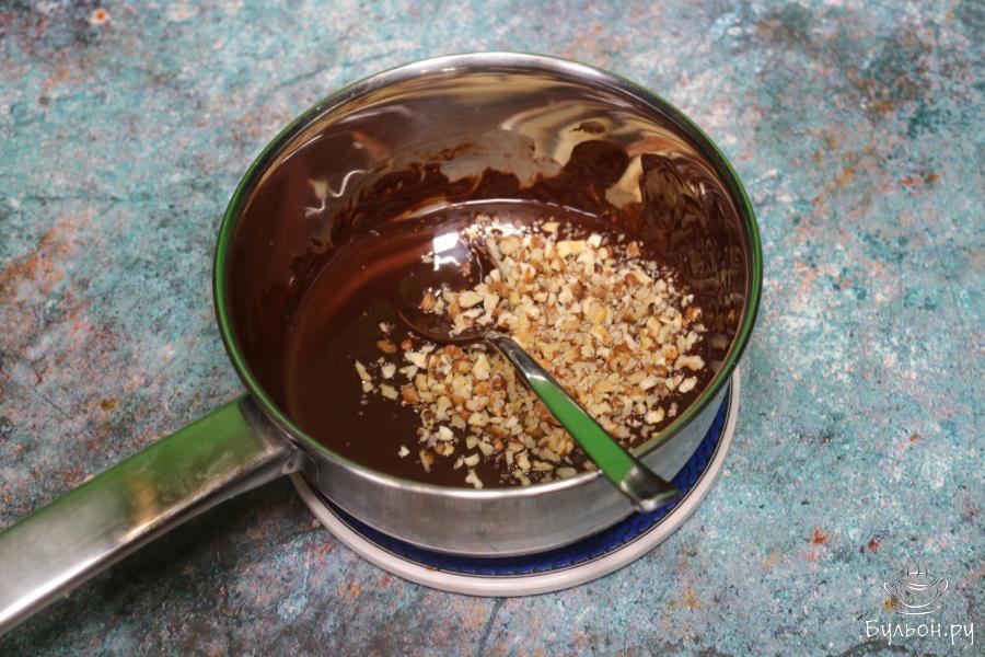 8. Доводим шоколадную массу до 35 градусов и выкладываем в нее кусочки орешков, перемешиваем и переливаем в стакан. Делаем все очень быстро.