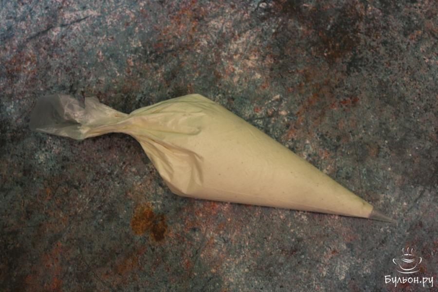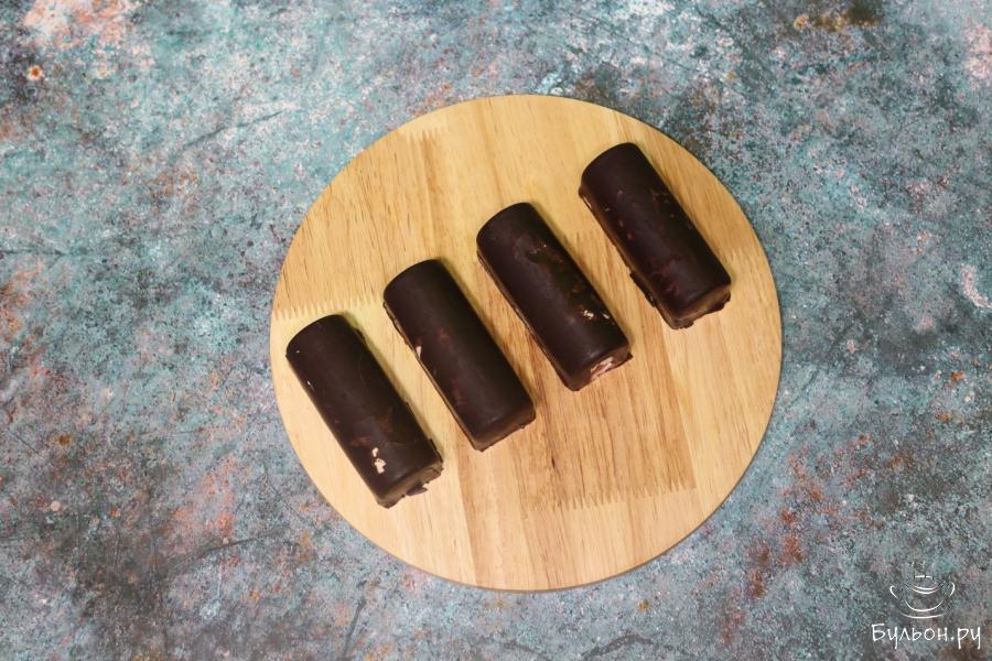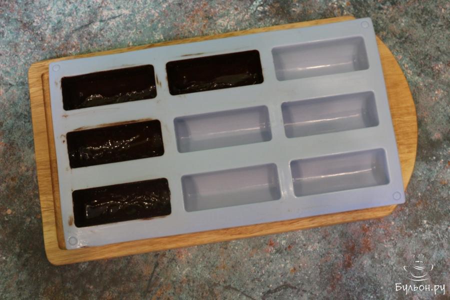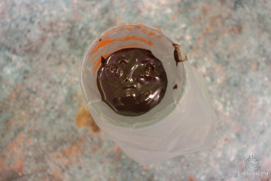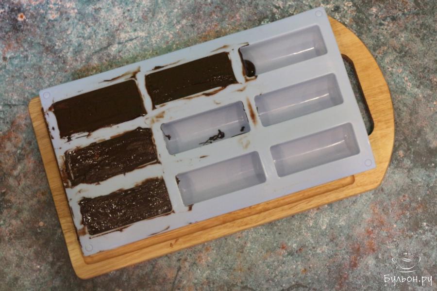 4. Отрезаем острый конец кондитерского мешочка и вливаем шоколад в формочки для сырков. Промазываем им дно и стенки каждой формочки. Убираем лишний шоколад и промазанные шоколадом формочки ставим в холодильник для охлаждения и затвердевания.