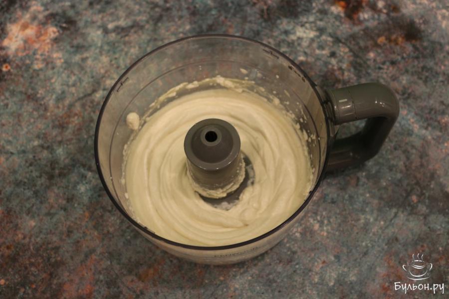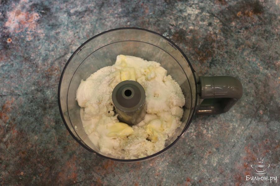 5. Готовим начинку. В фудпроцессор или чашу блендера кладем творог, мягкое масло, пудру и сахар ванильный.