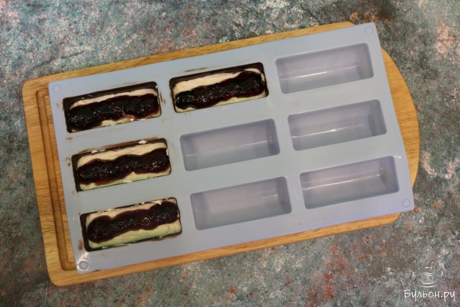 8. Достаем форму с застывшим шоколадом и заполняем ее наполовину творожной начинкой. Далее кладем джем.