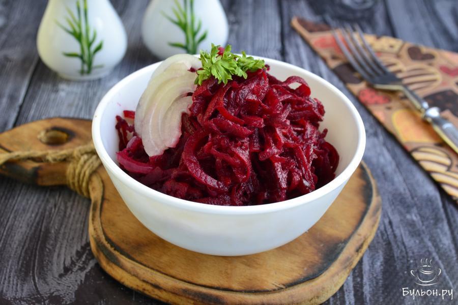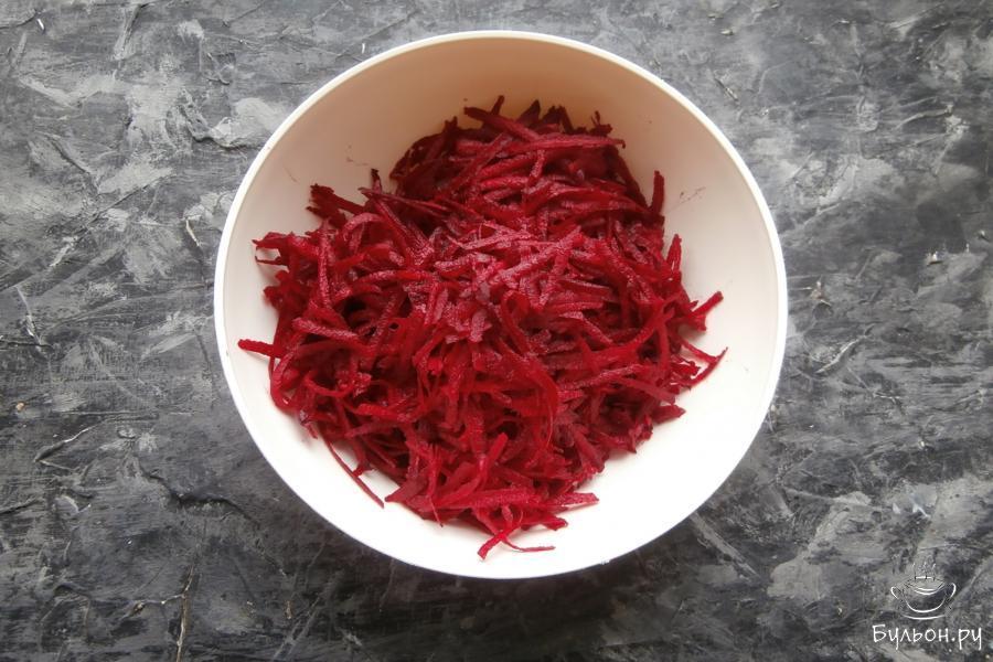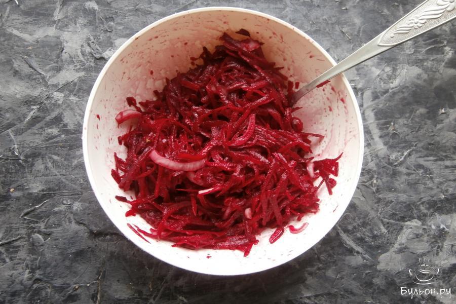 5. Залить свеклу с чесноком и луком заправкой, посолить по вкусу и немножко поперчить, все перемешать. Накрыть посуду со свеклой крышкой и отправить в холодное место на 1,5-2 часа. Через час свеклу нужно перемешать.