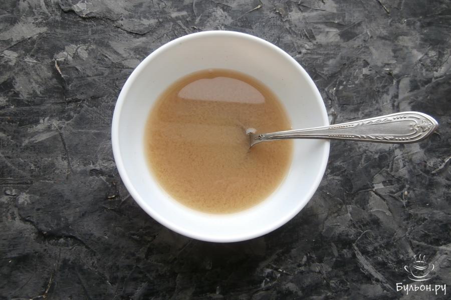 4. Приготовить заправку для свеклы: смешать 50 мл очищенной воды с 1 ч. ложкой горчицы, 3 ч. ложками сахарного песка и 2 ч. ложками уксуса 9-процентного. Сахар должен полностью раствориться в жидкости.