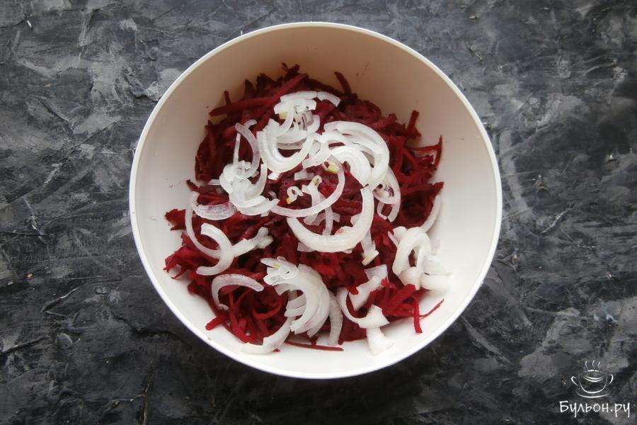 3. Добавить к свекле 1-2 зубчика пропущенного через чесночницу чеснока и половинку небольшой луковицы, порезанной тоненькими четвертинами или полукольцами.