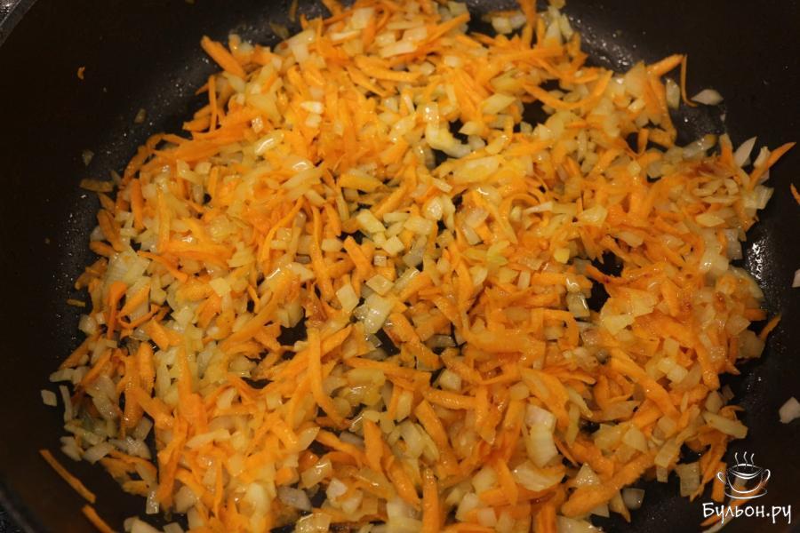2. Выложим их на сковородку, вольем масла, хорошо и постоянно перемешивая, поджарим овощи до характерного запаха жареного лука.