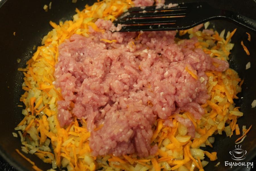 3. Сразу же добавим свинину, которую заранее нужно пропустить через мясорубку один раз. Снова мешаем и жарим ингредиенты. Зажаривать ничего не нужно, просто доводим мясо до светлого цвета. Это когда оно теряет свой розовый оттенок и перестает казаться, что фарш сырой.