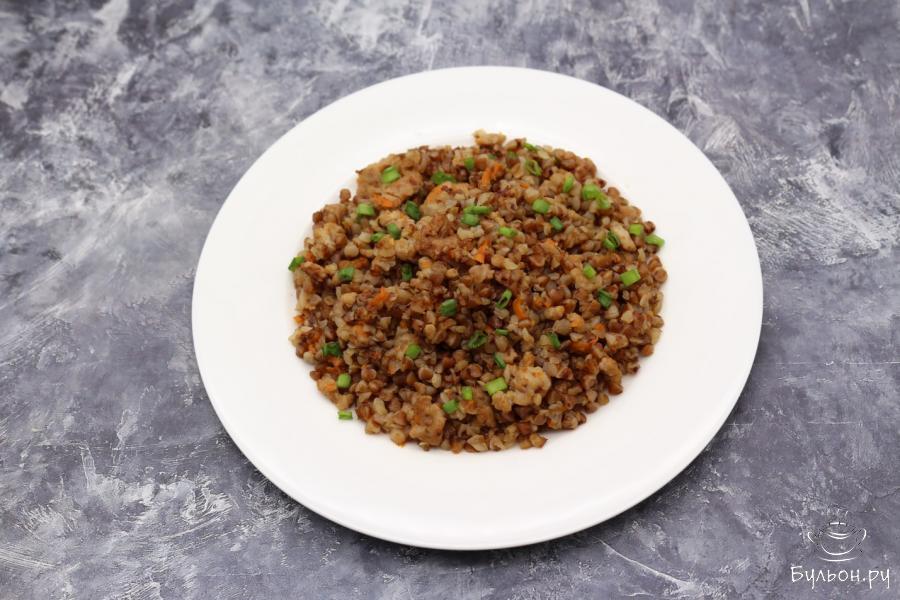 Приготовьте вкусный и полезный ужин - гречку, жаренную с мясом и овощами. Блюдо получается полноценным, так как в нем содержится и крупа, и мясо, и овощи. А еще оно довольно диетическое, но в то же время сытное. В итоге получается очень ароматное и совсем не сухое блюдо, к которому можно подать свежие овощи или соленья. Для большей красоты гречку можно украсить колечками зеленого лука, петрушкой или другой зеленью.