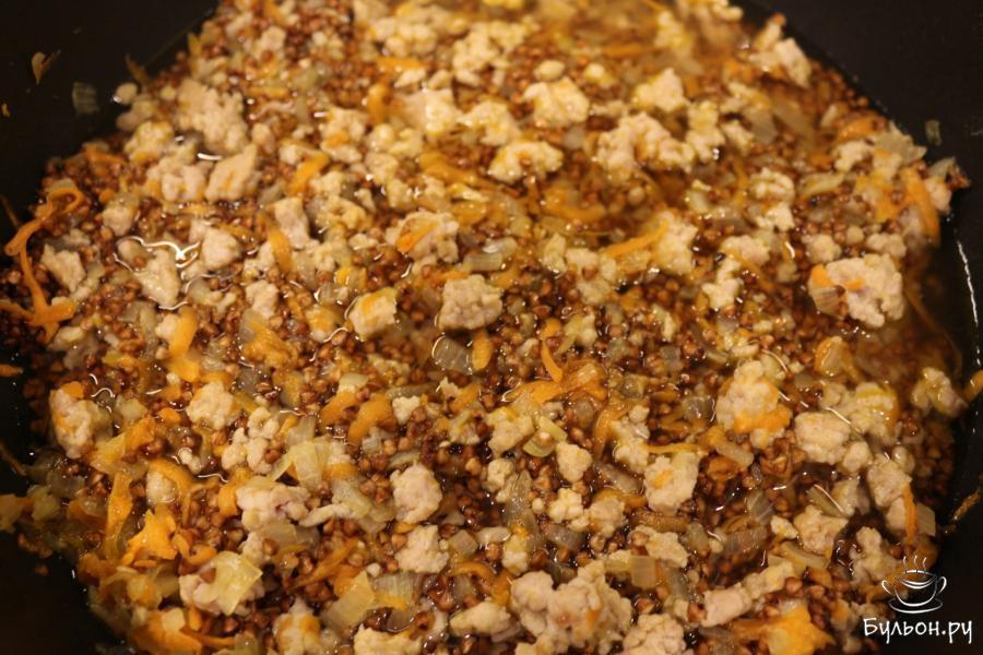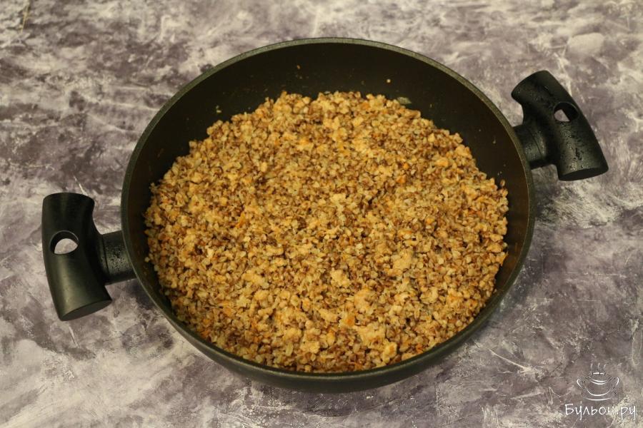 6. Далее гречку солим, перемешиваем и готовим под крышкой еще в течение 10 минут, но уже на очень слабом огне.
