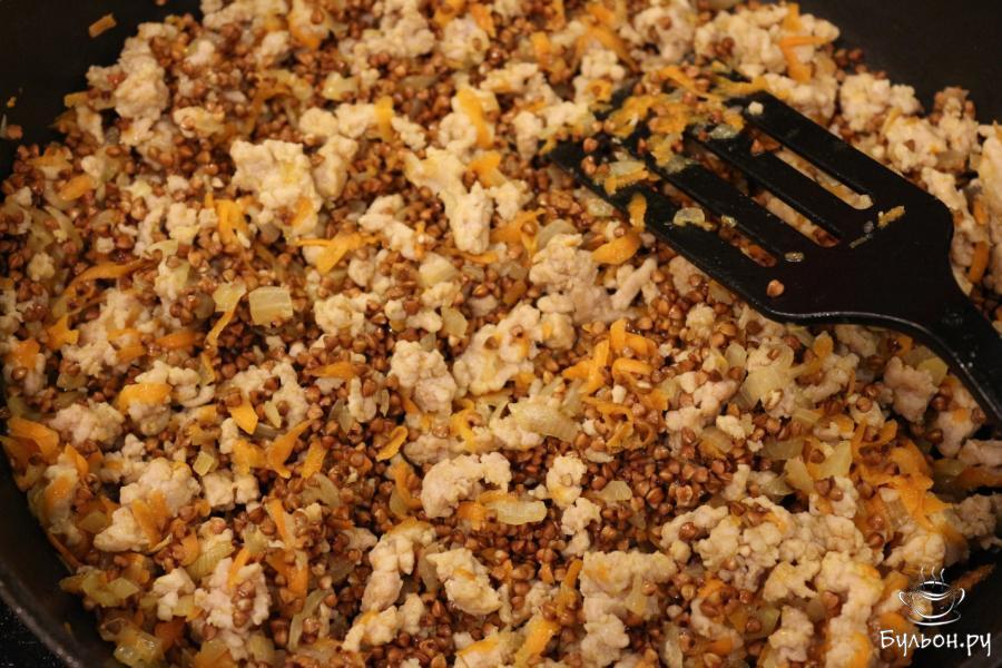 4. Далее добавляем гречку и жарим ее вместе с остальными ингредиентами еще 2 минуты. Делаем это для того, чтобы гречка не разварилась позже, а осталась рассыпчатой.