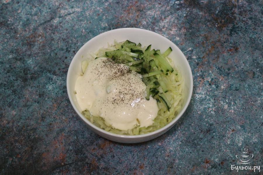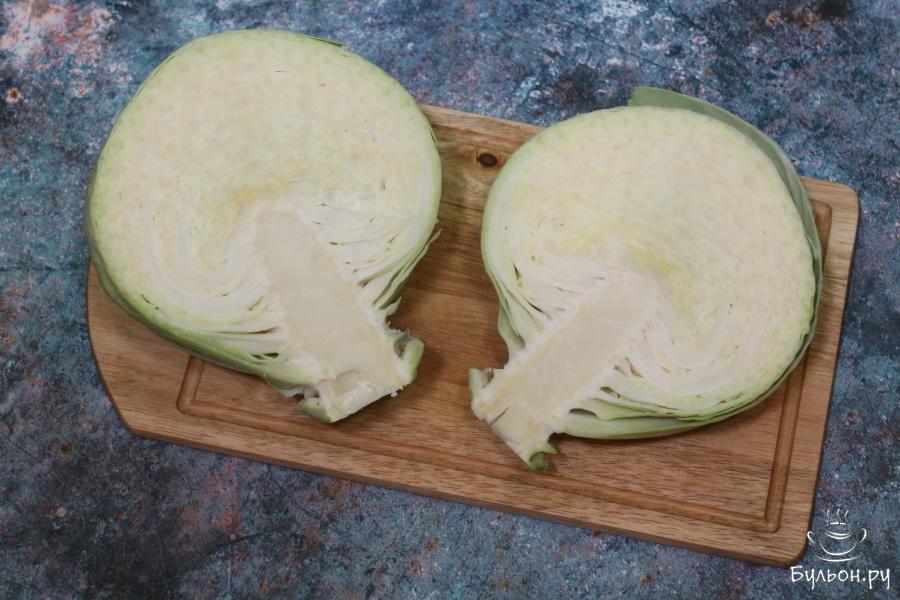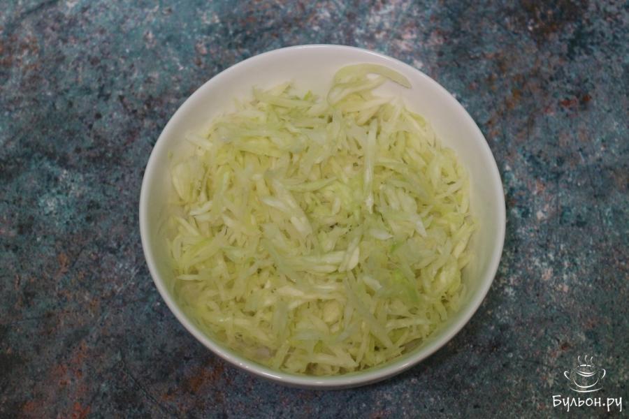 8. Капусту шинкуем некрупно. Кладем ее в миску, тарелку или другую емкость и солим, перемешиваем и даем настояться минут 15.