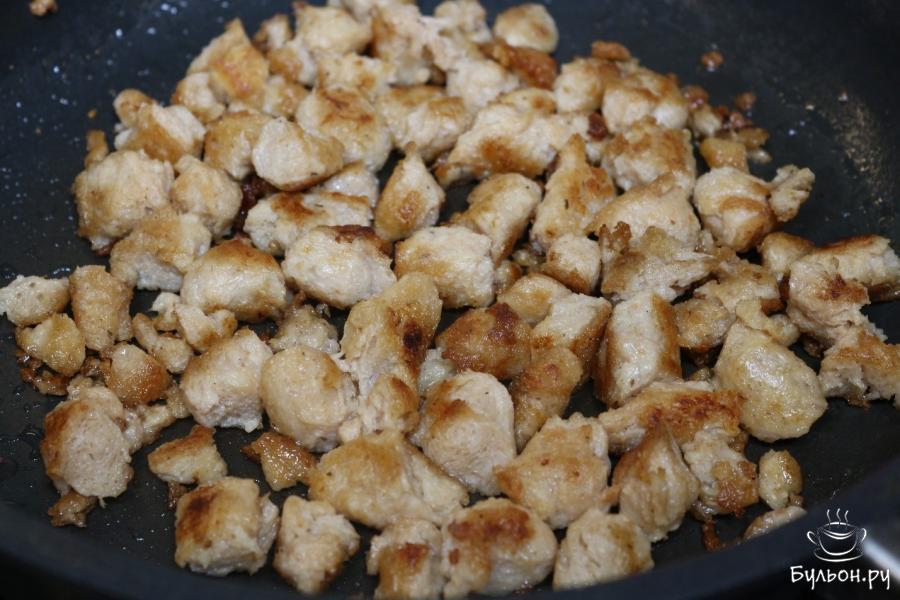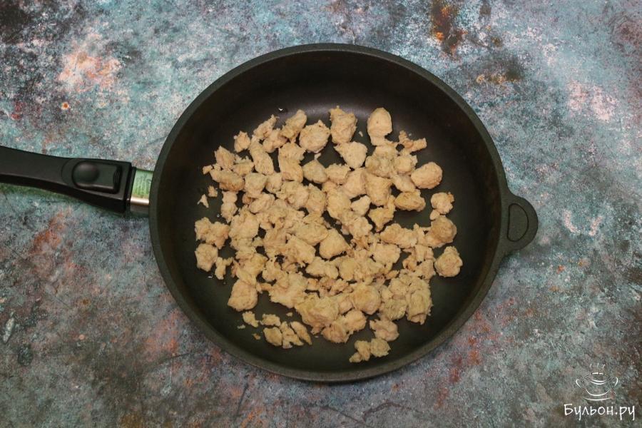 6. К соевому мясу добавляем масло и жарим их на средней мощности плиты, время от времени перемешиваем. Доводим его до готовности.