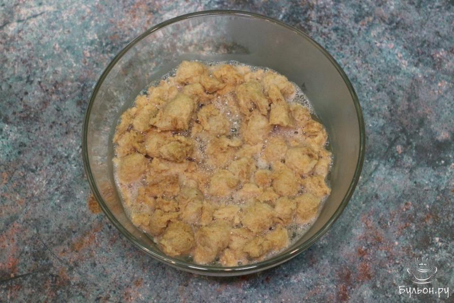 5. Затем берем мясо руками порционно и выжимаем воду, которой еще много находится в соевом мясе. Уже более сухие кусочки кладем в сковородку. Берем следующию порцию и так далее.