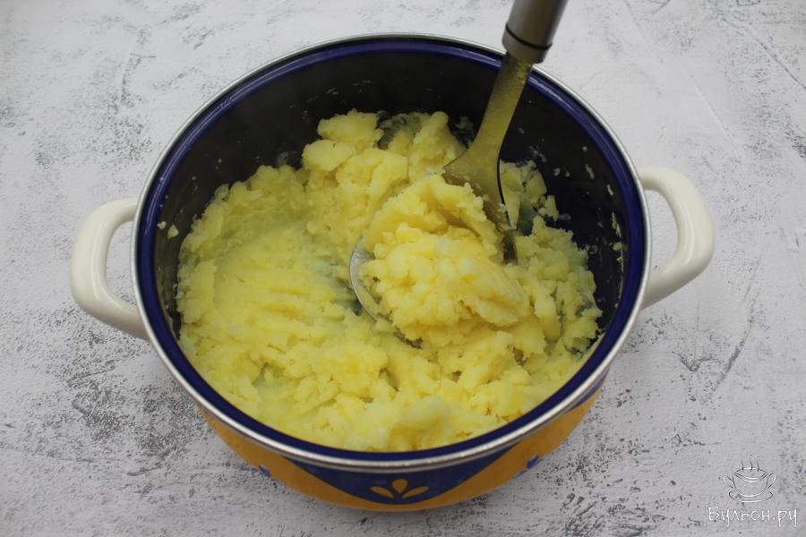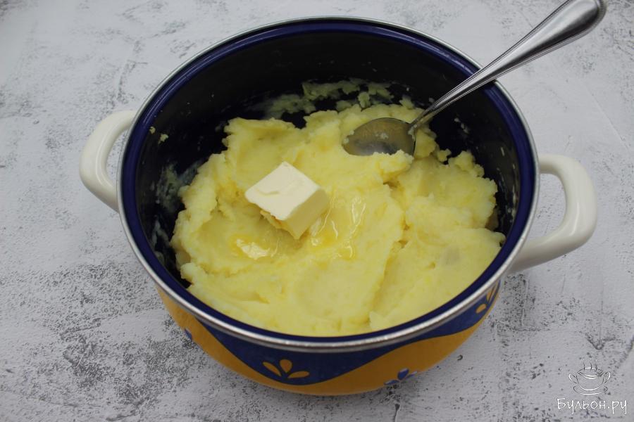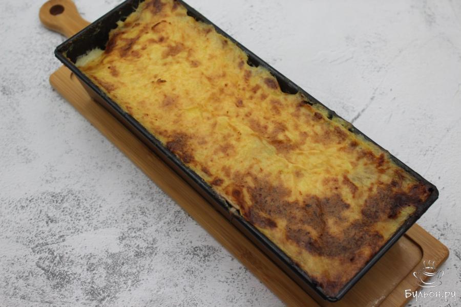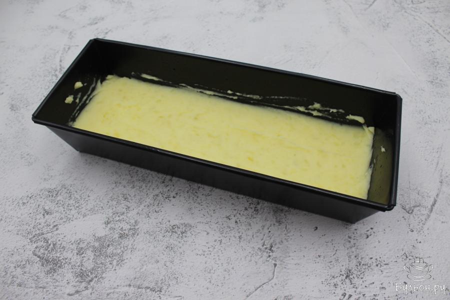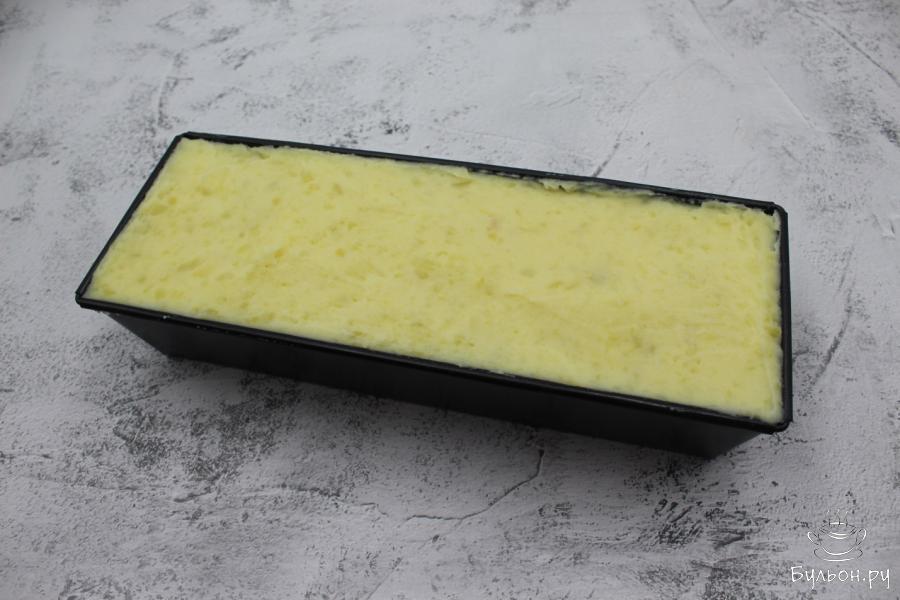 6. Прямоугольную форму для выпечки хлеба размером 30см на 10см смажем растительным маслом и выложим часть картофельного пюре, разровняем.