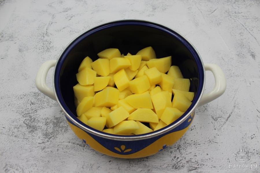 1. Первым делом чистим, моем и режем картофель на небольшие кусочки, это позволит картофелю дойти до готовности всего за 20 минут. Соответственно, варим картофель в кипящей воде 20 минут.