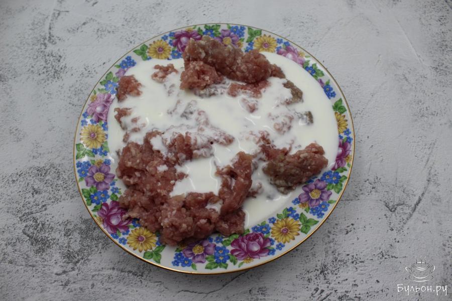 2. В это время в фарш вливаем кефир, желательно выбрать жирность 2,5% -3,2%, приправляем солью и перцем, и перемешиваем. Пока готовится картофельная часть запеканки, фарш впитает в себя кефир и станет очень сочным.