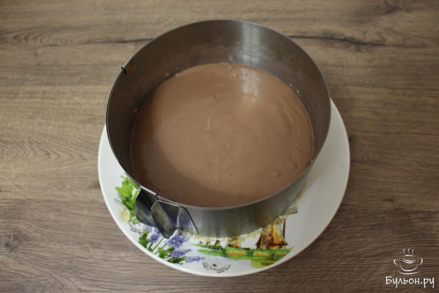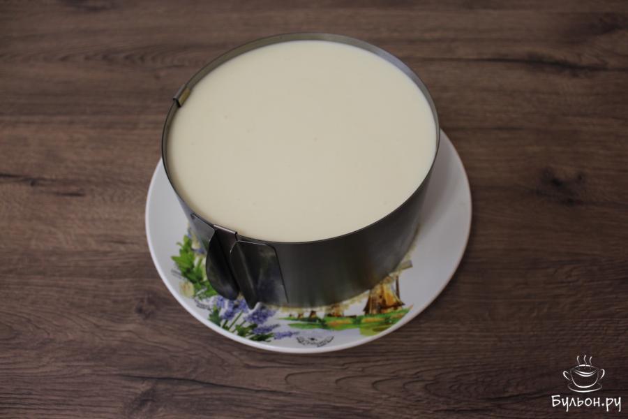 9. Добавим в чашу взбитые до мягких пиков сливки и аккуратно перемешаем лопаткой, лучше силиконовой. Готовую массу перельем в металлическое кольцо. На полчаса уберем торт в холодильник.