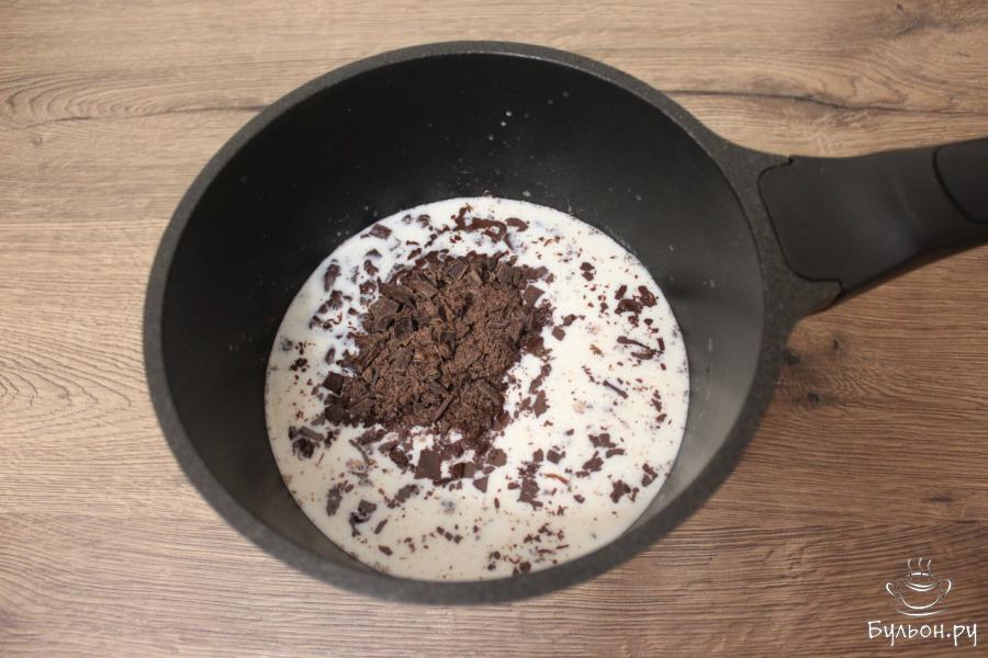 3. 100 мл молока вместе с 25 г сахара поставим разогреваться на плиту, но не кипятим молоко, сахар должен раствориться просто в горячем молоке. Затем всыпем 100 грамм измельченного темного шоколада и размешаем, чтобы молочная смесь была единого цвета. Снимем ковшик с огня.
