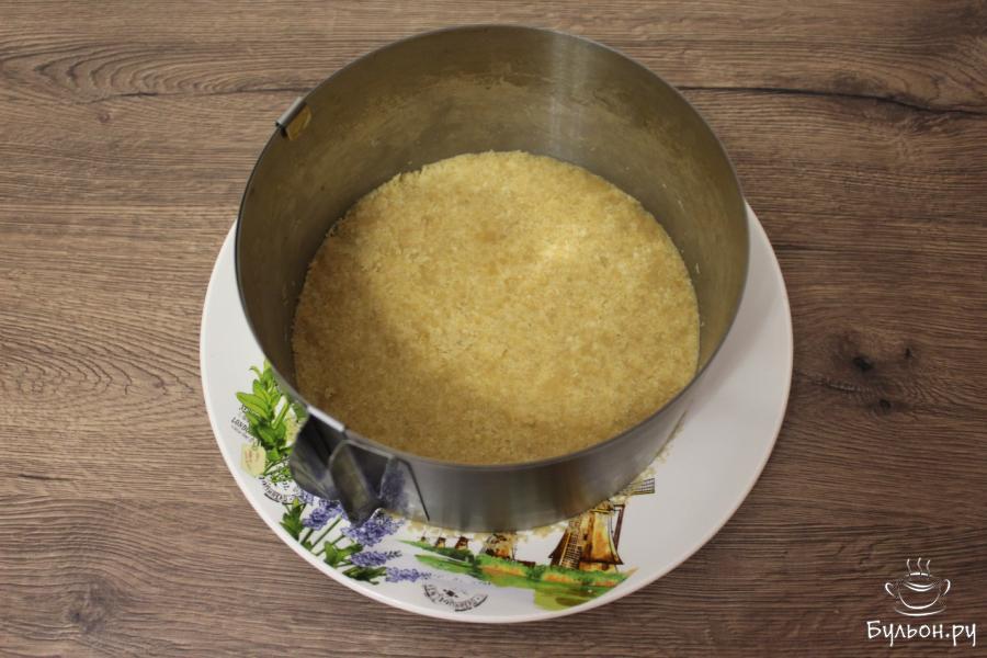 2. Металлическое кольцо диаметром 16-18 см поставим в центр блюда, высыпем в кольцо мокрую сливочную крошку и сформируем основу торта.