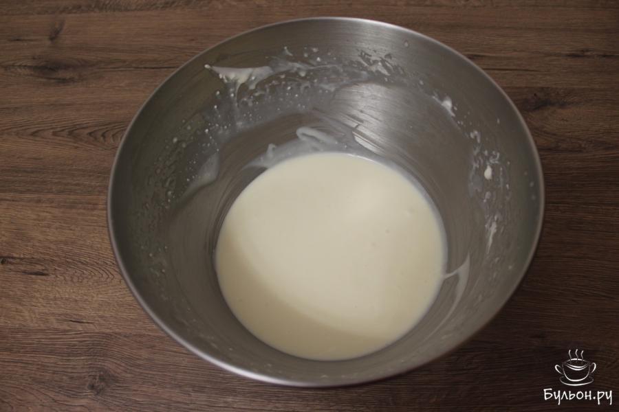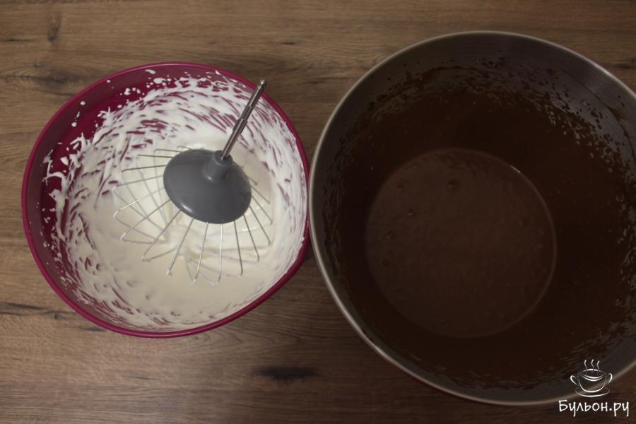 5. Перельем шоколадно-молочную смесь в чашу для взбивания, чтобы она остывала. В это время взобьем 100 мл холодных 33-35% жирности сливок до мягких пиков.
