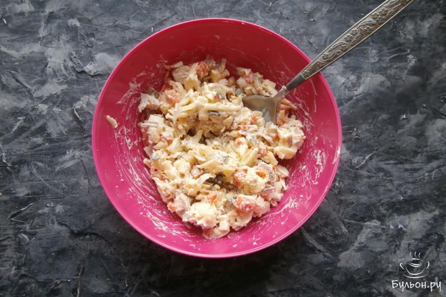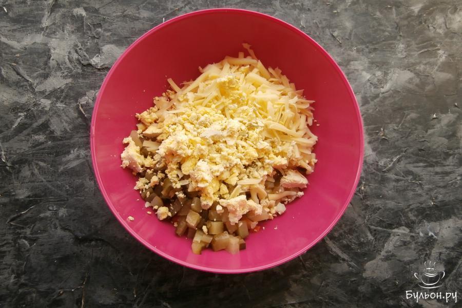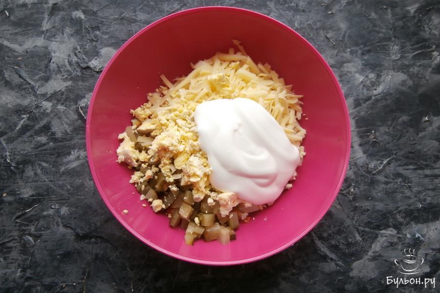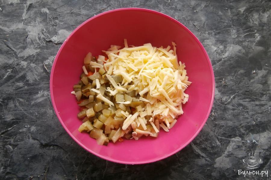 3. 1 средний маринованный огурец нарезать теми же кубиками и добавить в салат вместе с 50 г натертого сыра.
