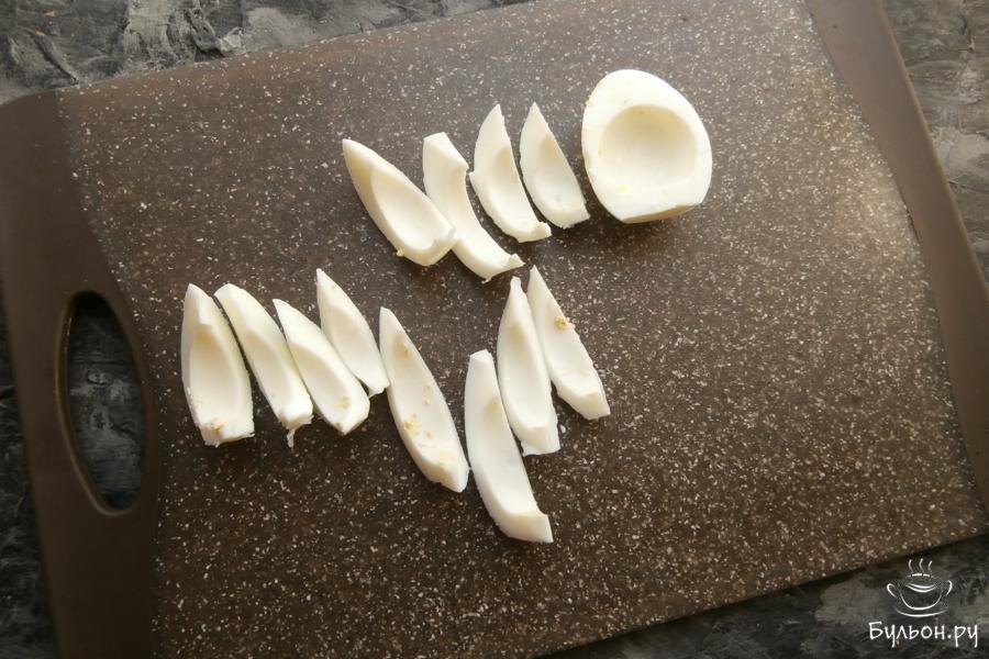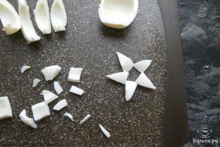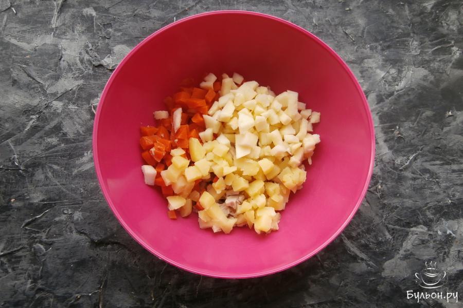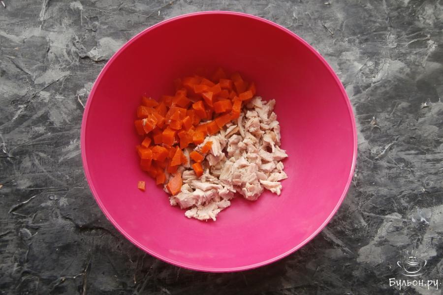 1. Заранее нужно сварить куриное филе, картошку, морковку и яйца. 150 г курицы остудить и порезать кусочками, добавить 1 небольшую морковку, порезанную маленькими кубиками (узкую часть оставить для украшения).