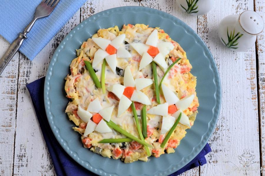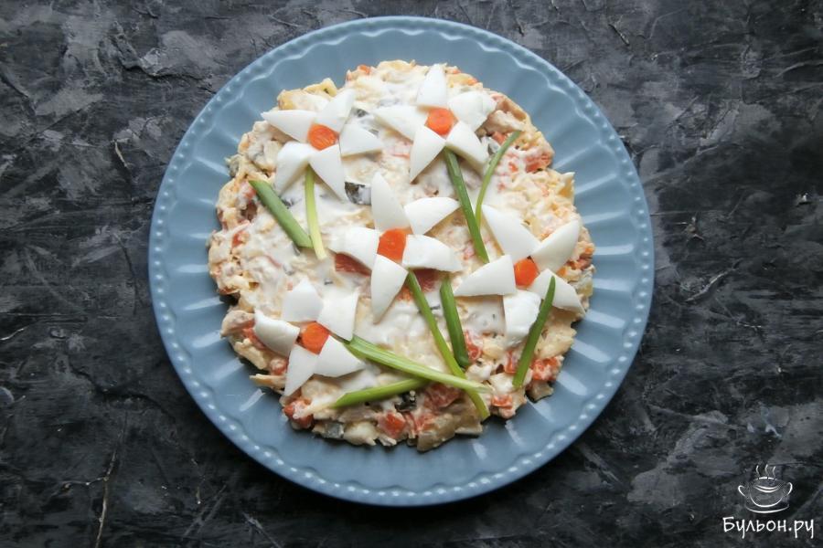 10. Салат выложить в тарелку или в салатник, разровнять и выложить 5 нарциссов, в серединку поместить кружочек из узкой части морковки, которую оставили. Листья цветов, стебли будут из перьев зеленого лука.