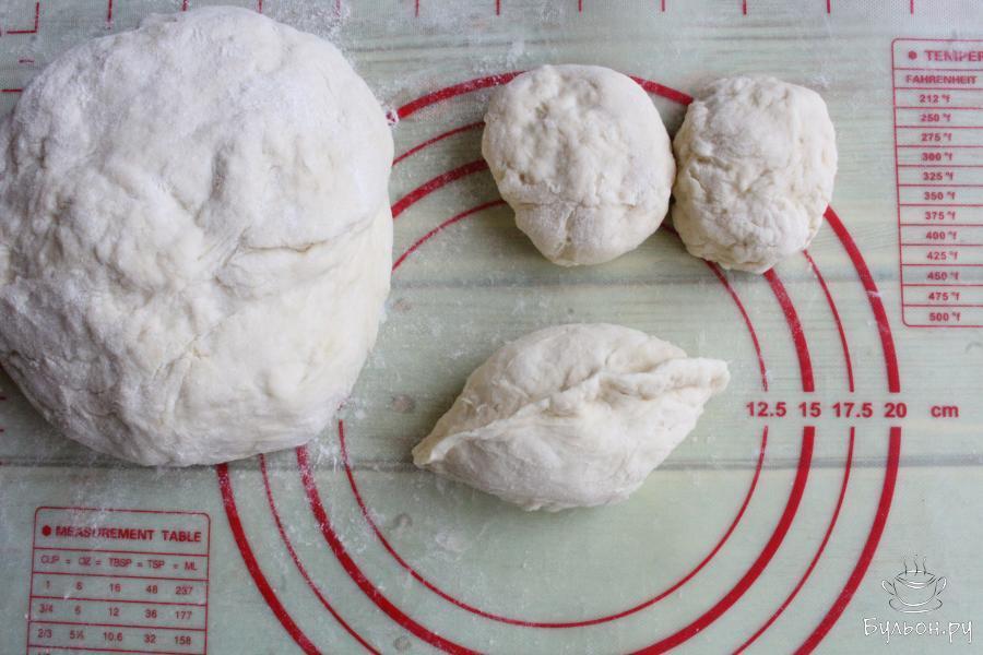 9. Делим тесто на 14 кусочков, можно разделить на большее количество, тогда пирожки будут поменьше размером. Руками делаем из кусочков теста лепешечки, раскладываем на них по 0.5 ст. л. начинки.