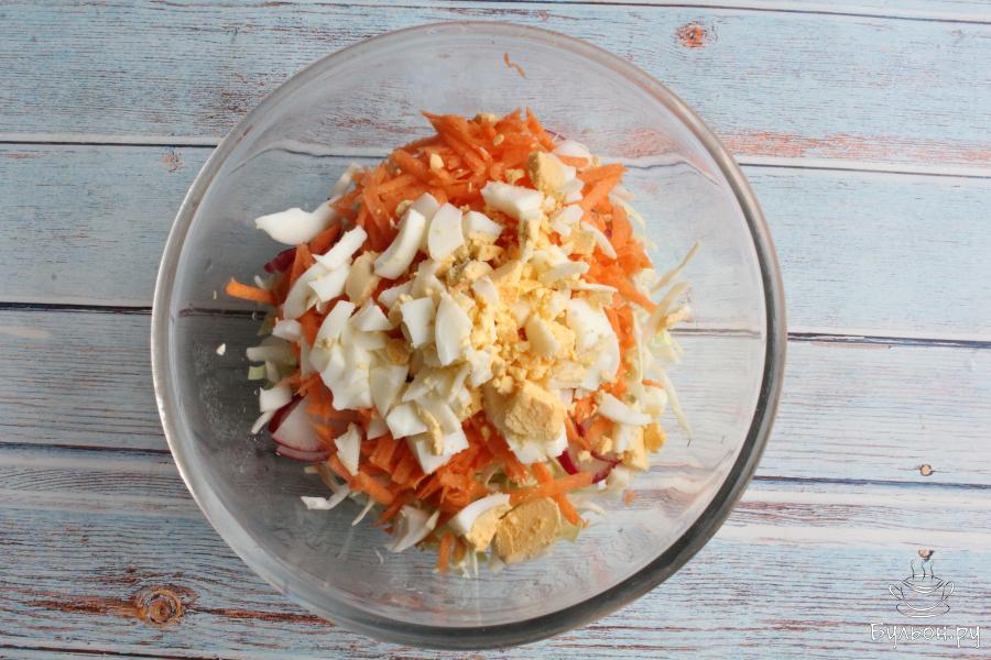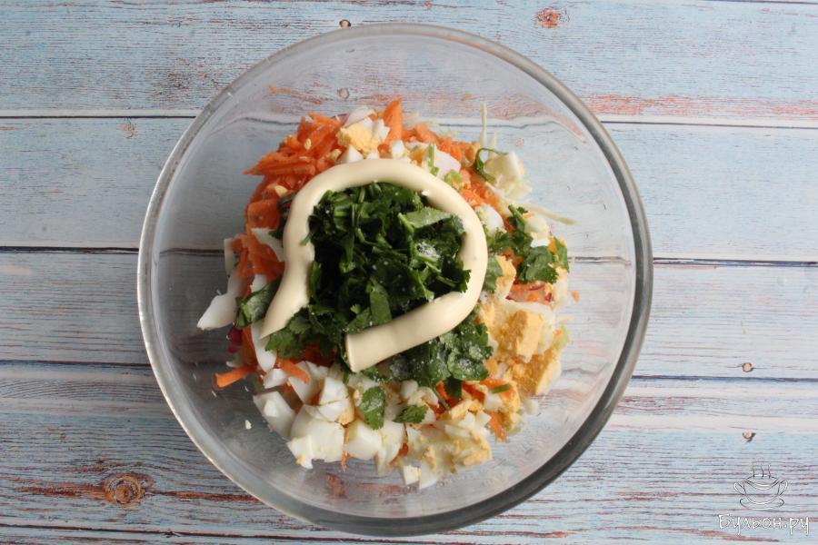 6. Заправляем салат майонезом, если нужно добавляем соль. Салат хорошо перемешиваем и можно сразу подавать его к столу.