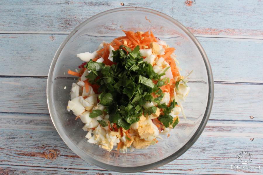 5. Кинзу промоем, обсушим и мелко нарежем ножом. По желанию можно добавить в салат любую другую зелень, которую вы предпочитаете.