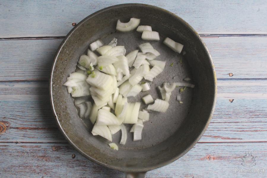 2. Пока макароны варятся, очистим и промоем лук. Нарежем лук мелко и обжарим его 3-4 минуты на разогретом масле до золотистого цвета.