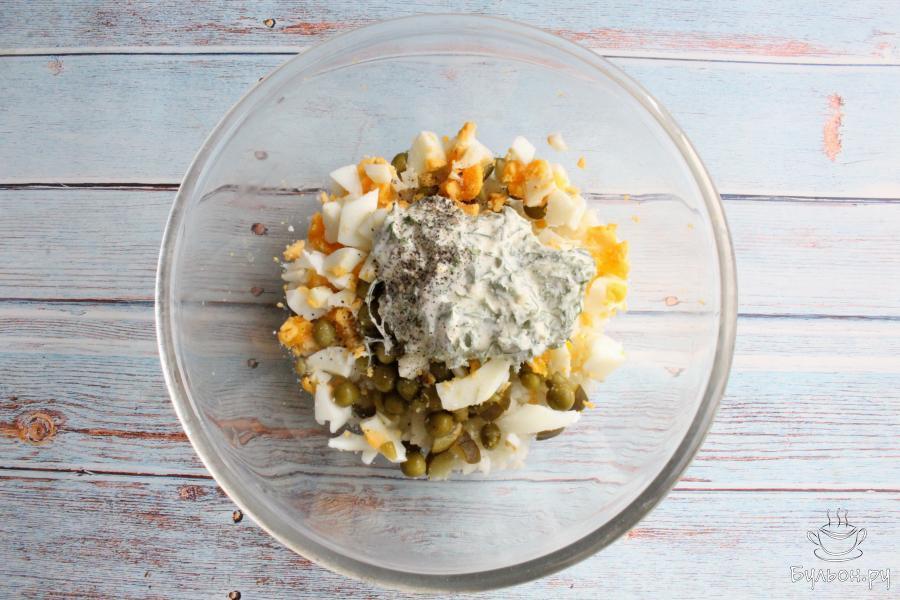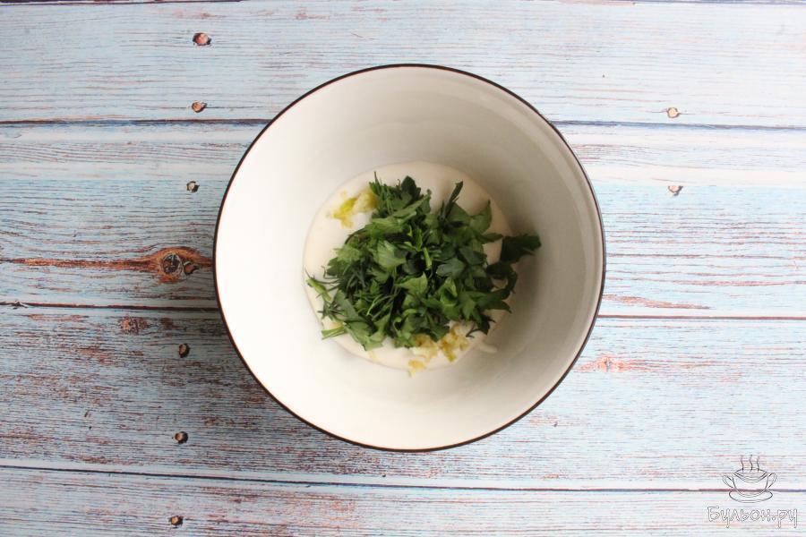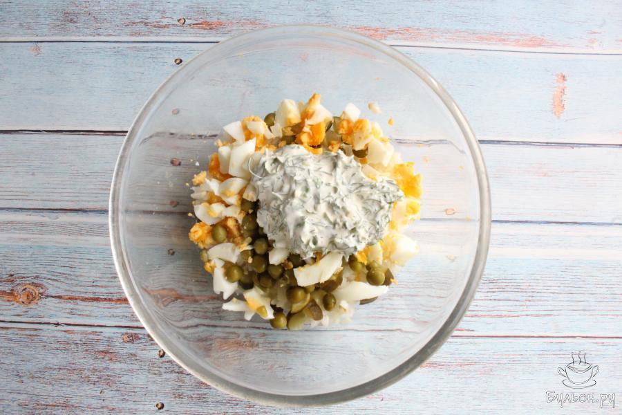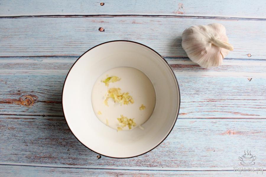 5. В сметану добавим продавленный через пресс чеснок. Сметану для салата желательно брать густую и жирную.